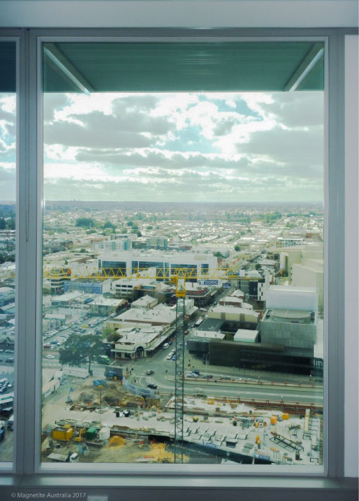 An impressive 10°C differential was recorded at the base when Magnetite® was in place, where there was direct sunlight. Following this significant improvement, Magnetite 4.5mm panels were retrofitted to 64 existing aluminium windows, creating a 60mm air cavity on levels 17 to 19. Six months later, Magnetite® has been scheduled to be installed on level 14 to 16, with the aim of significantly cooling the indoor environment and reducing the cooling load for the building's chiller systems.